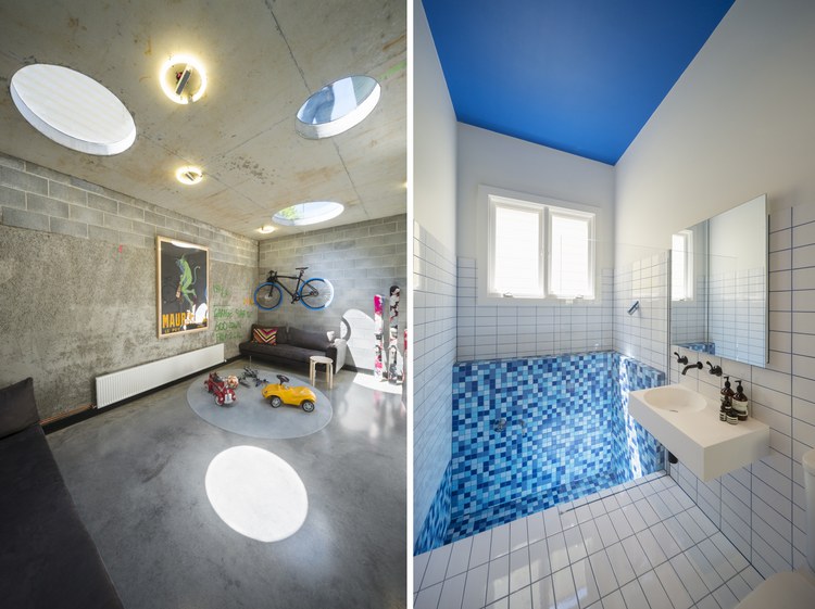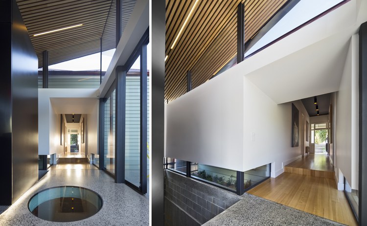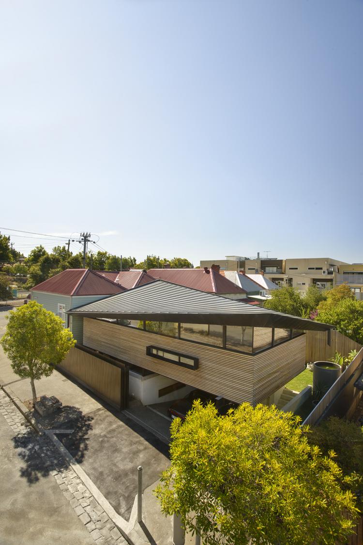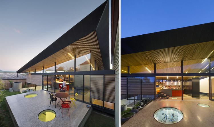 胭脂魚住宅是對一座位于澳大利亞墨爾本郊區獨立住宅的擴展,負責設計的March Studio工作室以設計了一系列精品商店而著稱。角度扭曲的屋頂成為住宅的一大特色。住宅的新建部分將原有房子的面積擴大了一倍。對于原有建筑,建筑師只保留了愛德華時期的立面,內部空間被重新規劃成只容納臥室和衛生間的布局。新建部分為兩層,首層局部埋在地下,容納了車庫與活動室。有趣的是分割一層與二層的地板上開設了許多圓形的洞,并安裝上鋼化玻璃,使得地下與地上得以連通。